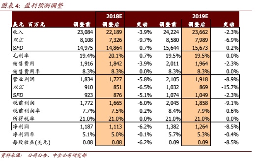 我们分别下调万洲18、19两年盈利预测6.2%和8.5%以反映 1)短期美国与欧洲屠宰和养殖业务表现疲软,2)中国区业务盈利受到非洲猪瘟病轻微影响,以及3)人民币兑美元汇率贬值等的影响。
