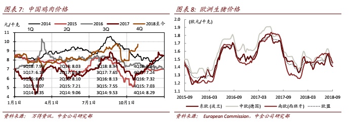 欧洲收购产能预计年底前获批带来盈利改善预期。罗马尼亚肉制品产能收购(收购后产能可从现有25000吨增加至45000吨)以及波兰PINI工厂剩余66.5%股权收购在经历一年后有望于年底前获批,从而使得欧洲区业务来年盈利预期改善前景提升,欧洲业务三年(2016年起)营业利润增长两倍的目标因此不变。同时,今年前三季度欧洲猪价在疾病带来的供应短缺过后同比大跌13%的情形也使得来年万洲在欧洲区的屠宰业务有望在18年低基数上获得来自规模提升(产能增加)的利好。