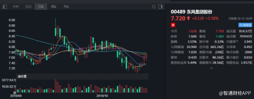 截至今日收盘,东风集团股份(00489)报7.72港元,涨1.58%。
