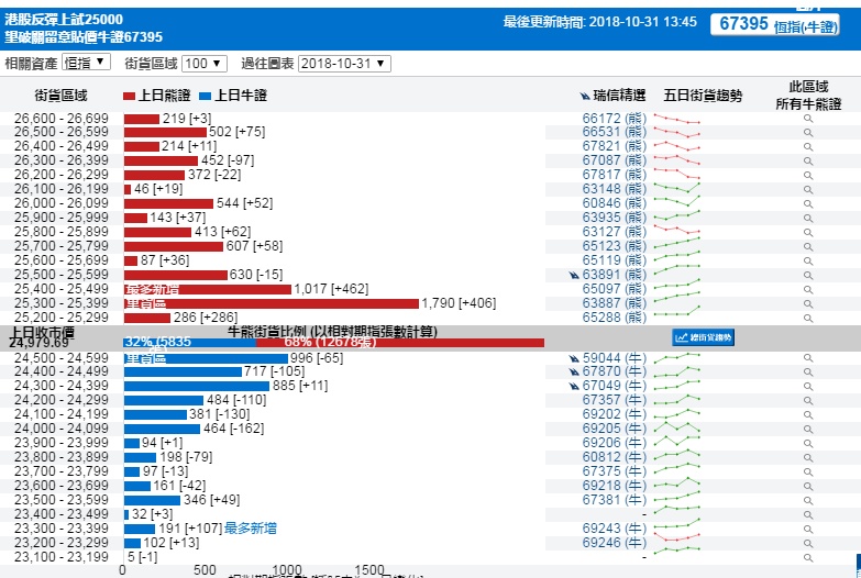 智通财经APP获悉,截至10月31日,恒指最新的牛熊街货比例32:68。从瑞信恒指牛熊证街货分布图中得到的数据显示,熊证街货重货区在25300-25399区间,该区间熊证数量为1390张,比上一交易日增加406张;最多新增在25400-25499这一区间,新增462张。牛证中重货区在24500-24599区间,该区间最新牛证数量为996张,比上一交易日减少65张;最多新增在23300-23399区间,新增107张。