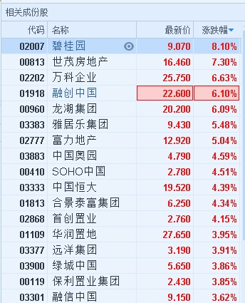 智通财经APP获悉,内房股全线反弹,截至9时54分,碧桂园(02007)涨8.1%,报价9.07港元,世茂房地产(00813)涨7.3%,万科企业(02202)涨6.63%,融创中国(01918)涨6.1%,龙湖集团(00960)涨6.09%,中国恒大(03333)涨4.39%,华润置地(01109)涨3.95%,融信中国(03301)涨3.62%。