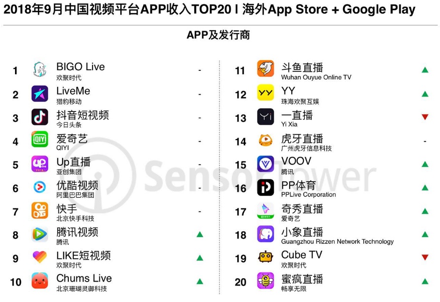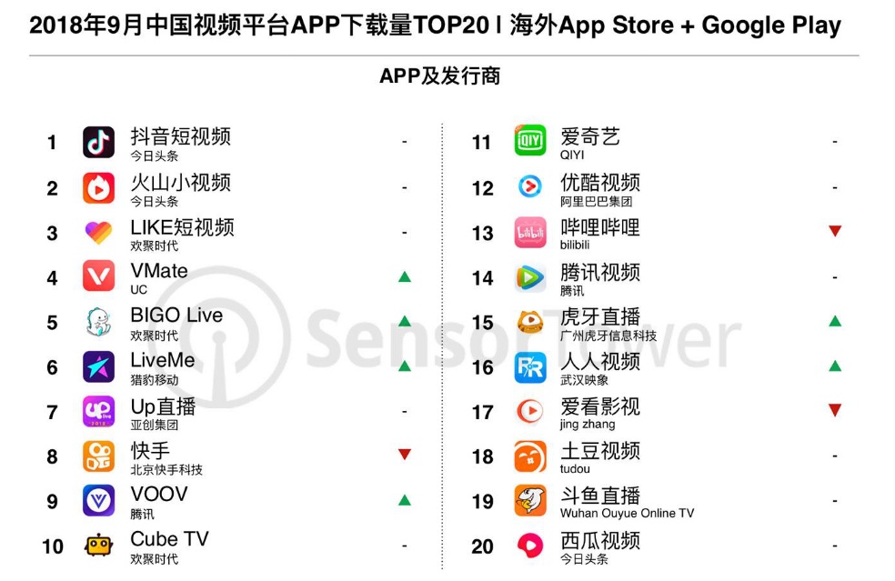 智通财经APP获悉,Sensor Tower商店情报平台数据显示,2018年9月期间,中国视频平台类应用(包含短视频社交平台,直播平台,及传统视频平台),在中国大陆以外的 App Store 及 Google Play 下载量及收入排名 TOP20。