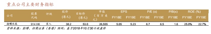 今年全年水泥价格呈现出高位震荡、季节性波动降低的特点,需求南方显著好于北方,符合我们年初的判断。近期由于市场对2019年需求预期调整,以及水泥板块前期累计涨幅较高,板块估值整体回调,目前H股水泥行业平均估值7.1/1.1倍前瞻市盈率/市净率,低于历史平均。我们维持对水泥行业基本面的判断,四季度推荐关注盈利确定性高、水泥价格稳步推涨的海螺水泥(00914)