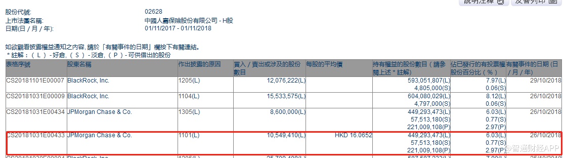 智通财经APP获悉,根据联交所资料显示,摩根大通于10月26日增持中国人寿(02628)1054万股,每股作价16元,总值约1.69亿元,最新持股量增至6.03%。