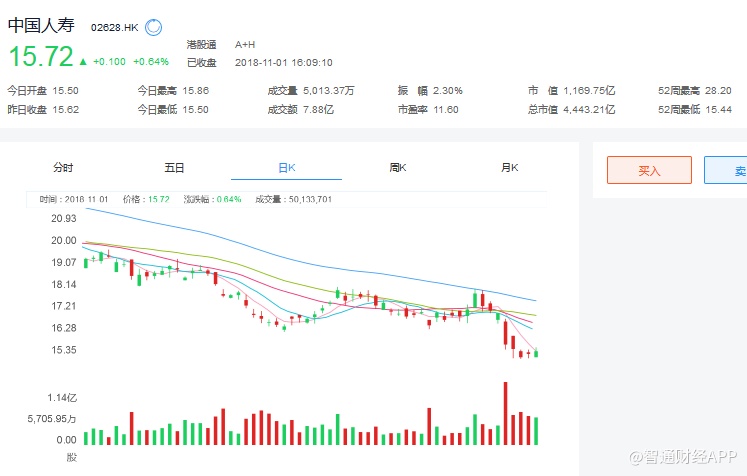 截至今日收盘,中国人寿(02628)报15.72元,涨0.64%。