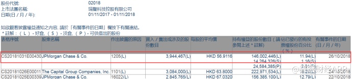 智通财经APP获悉,根据联交所资料显示,摩根大通于10月26日减持瑞声科技(02018)394万股,每股作价56.91港元,总值2.24亿港元,最新持股量减至11.94%。