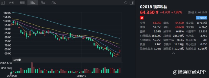 截至今日收盘,瑞声科技(02018)报64.35港元,涨7.88%。