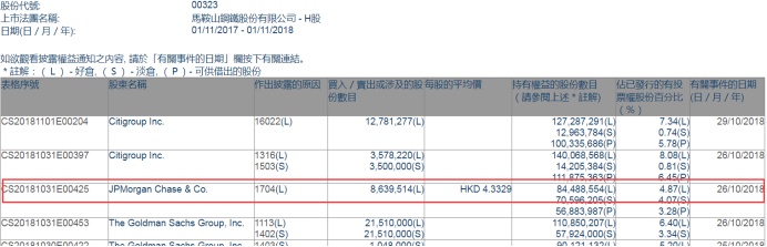 智通财经APP获悉,根据联交所资料显示,摩根大通于10月26日减持马鞍山钢铁(00323)863万股,每股作价4.33港元,总值3736.79万港元,最新持股量减至4.87%。