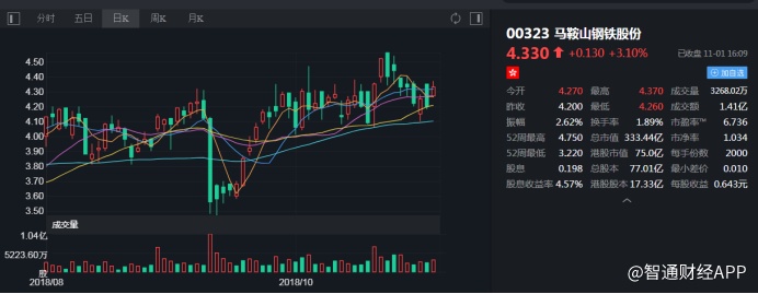 截至今日收盘,马鞍山钢铁(00323)报4.33港元,涨3.10%。