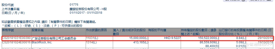 智通财经APP获悉,根据联交所资料显示,广发证券股份有限公司工会委员会于10月29日增持广发证券(01776)1500万股,每股作价9.5元,总值约1.43亿元,最新持股量增至8.84%。