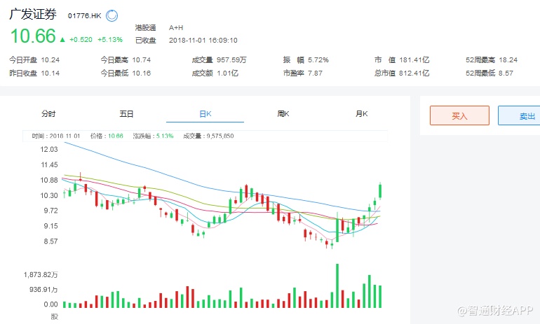 截至今日收盘,广发证券(01776)报10.66元,涨5.13%。