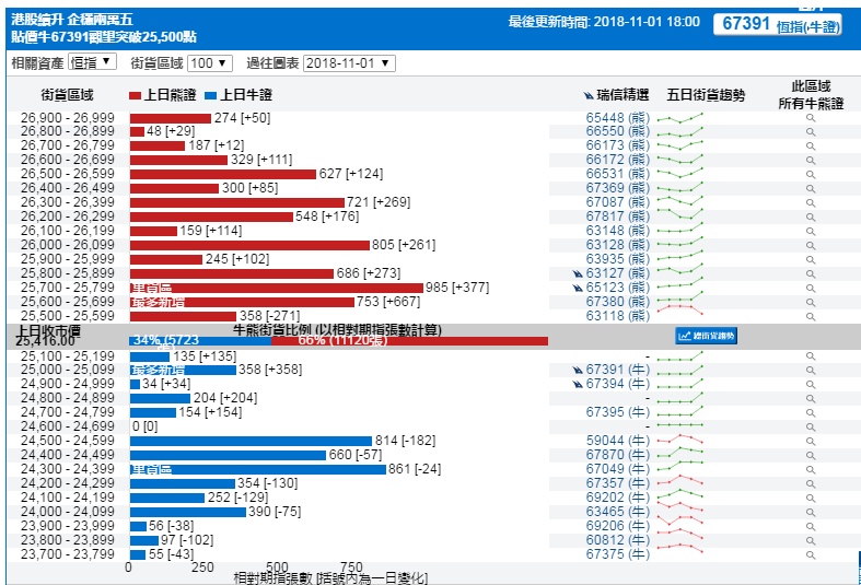 智通财经APP获悉,截至11月1日,恒指最新的牛熊街货比例34:66。从瑞信恒指牛熊证街货分布图中得到的数据显示,熊证街货重货区在25700-25799区间,该区间熊证数量为985张,比上一交易日增加377张;最多新增在25600-25699区间,新增667张。牛证中重货区在24300-24399区间,该区间最新牛证数量为861张,比上一交易日减少21张;最多新增在25000-25099区间,新增358张。