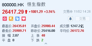 智通财经APP获悉,恒生指数收复两万六千点关口,午后持续攀升,一度涨超1000点,截至14时26分,恒指涨1001.29点或3.94%,报价26417.29点,成交额1247.2亿。腾讯(00700)截至14时25分,贡献指数198点。