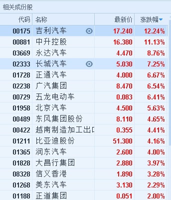 智通财经APP获悉,汽车股全线走强,吉利汽车领涨板块,截至13时43分,吉利汽车(00175)涨12.24%,报价17.24港元,中升控股(00881)涨11.13%,长城汽车(02333)涨7.25%,广汽集团(02238)涨6.54%,北京汽车(01958)涨5.63%,比亚迪(01211)涨4.16%,报51.3港元。