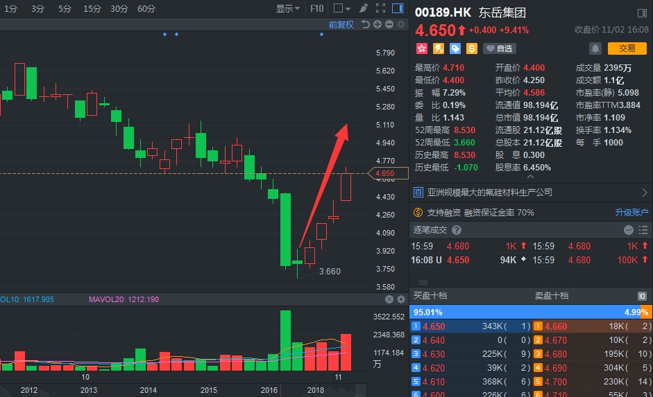 大市气氛将直接影响到投资者的风险偏好与入市意愿,个股走势受大市影响较为严重,尤其成交量大的股票。若大市升势遇阻,东岳集团在5港元位置股价或将有反复,但以其今年仍不足4倍PE的估值,5港元位置肯定也不会是这轮上升走势的终点。