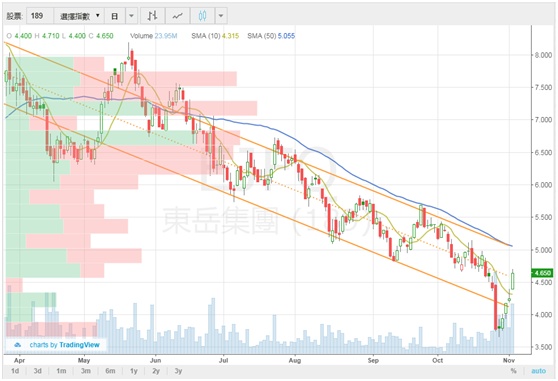 从技术走势上来看,10月26日出现放量大跌,随后几天股价回升,上升过程中的成交量也较往日有明显放大,说明资金入市抄底意愿强烈。今日收盘已经处于20日线4.6港元之上,目前虽未走出下降轨,但短期并无K线压制,预期升势短期将持续。