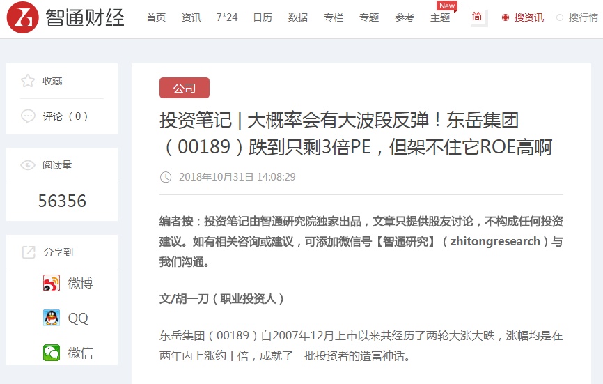 10月31日智通财经“投资笔记”专栏发文对东岳集团(00189)进行分析,结论为“搏个大波段反弹的胜算非常大”, 感兴趣的朋友可以点击此处回看:《投资笔记 | 大概率会有大波段反弹!东岳集团(00189)跌到只剩3倍PE,但架不住它ROE高啊》。