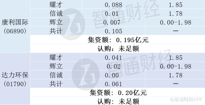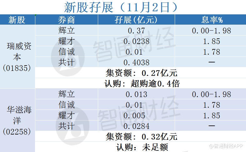 智通财经APP获悉,瑞威资本(01835)、华滋海洋(02258)、 康利国际(06890)、达力环保(01790)正在招股中。截至11月2日,辉立、信诚、耀才三家券商,为瑞威资本、华滋海洋、 康利国际、达力环保分别借出0.27亿元、0.32亿元、0.195亿元、0.20亿元孖展金,瑞信资本超购逾0.4倍,其余三家认购未足额。