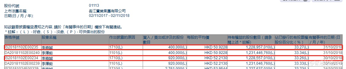 智通财经APP获悉,根据联交所资料显示,李嘉诚于10月30日及31日共增持长实集团(01113)132万股,30日每股作价52.2元,31日每股作价50.9元,总值约6839.2万元,最新持股量增至33.27%。