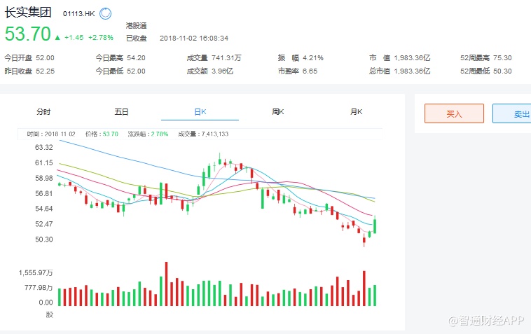 截至今日收盘,长实集团(01113)报53.7元,涨2.78%。
