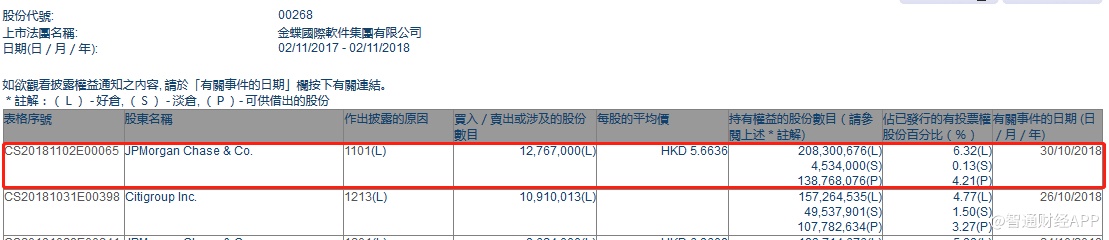 智通财经APP获悉,根据联交所资料显示,摩根大通于10月30日增持金蝶国际(00268)1276万股,每股作价5.6元,总值约7146万元,最新持股量增至6.32%。