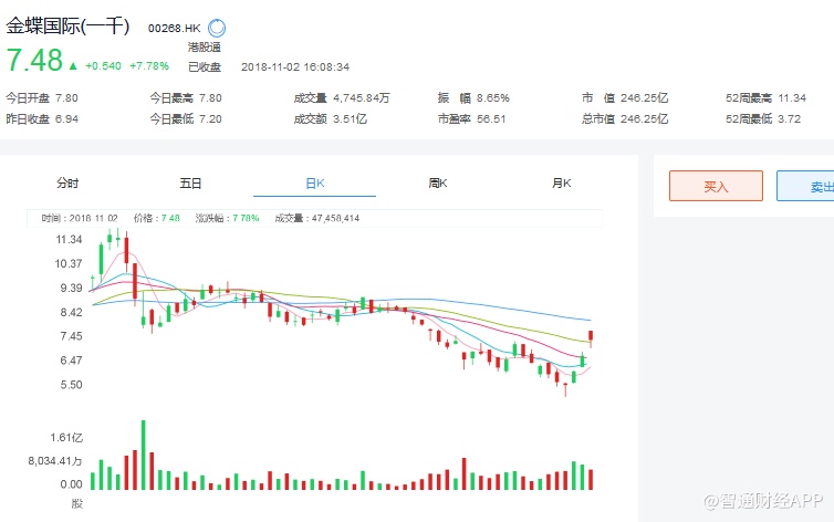 截至今日收盘,金蝶国际(00268)报7.48元,涨7.78%。