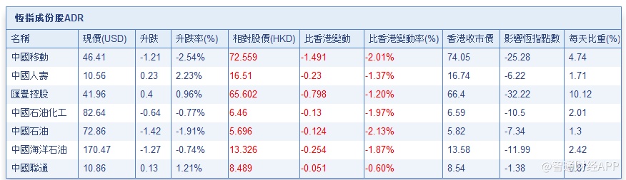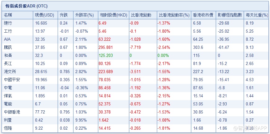智通财经APP获悉,港股ADR指数跟随美股回落,按比例计算,收报26054.52点,跌431.83点或1.63%。大型蓝筹全线承压,汇丰控股收报65.61元,较港收市跌0.79元;腾讯控股收报295.91元,较港收市跌7.69元。
