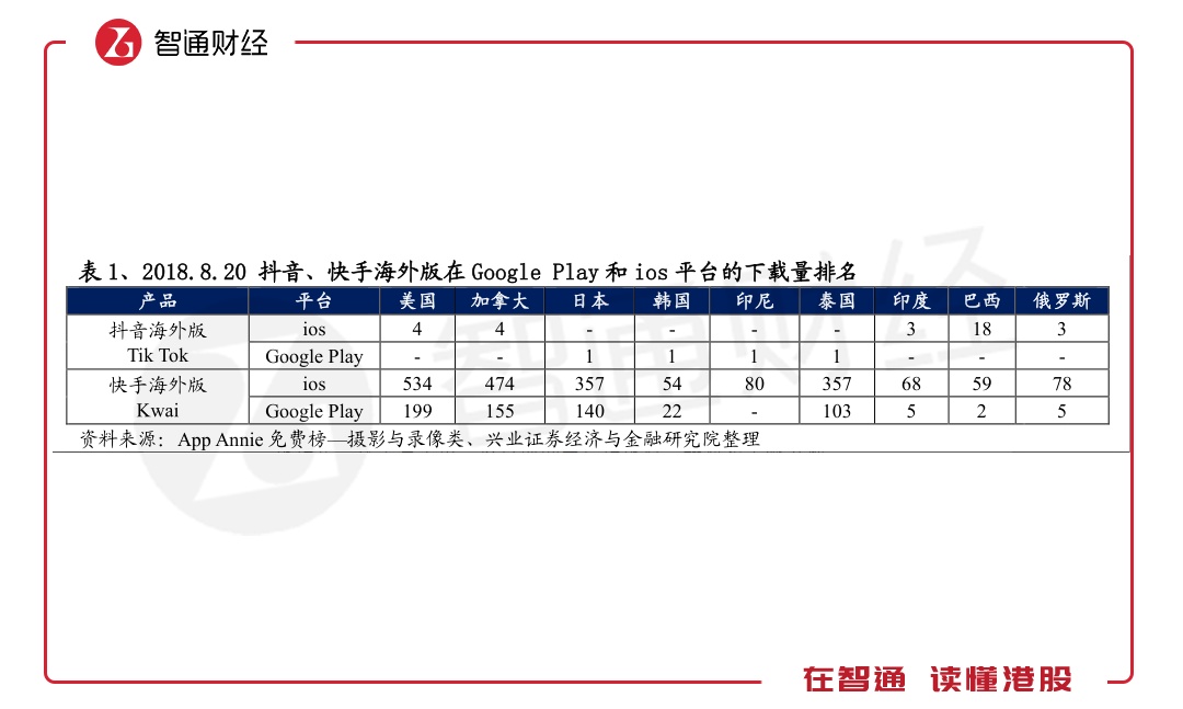 其二,在海外市场方面,抖音的打法明显更胜一筹。据兴业证券数据显示,快手海外版不管是ios还是Google Play平台,大部分下载量排名均远低于抖音海外版。
