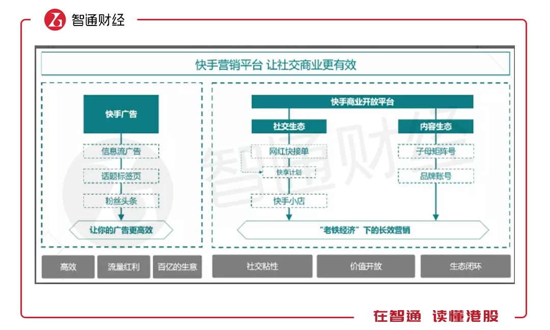 两个板块有着不同的商业化效用。快手广告是实现信息流广告的精准投放,而快手商业开放平台则是对网红主播们开放,通过社交生态及内容生态实现“老铁经济”下的长效营销。
