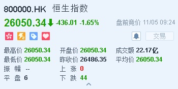 智通财经APP获悉,恒生指数开盘跌1.65%,报26050.34点。国企指数跌1.51%,报10526.09点。红筹指数跌1.03%,报4245.58点。大市盘前成交22.17亿港元。