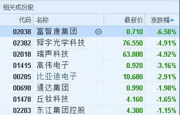 智通财经APP获悉,第三季度全球智能手机出货量同比降6%,手机产业链全线下跌,截至9时41分,富智康集团(02038)跌6.58%,报价0.71港元,舜宇光学(02382)跌4.91%,报76.55港元,瑞声科技(02018)4.92%,报63.8港元,高伟电子(01415)跌3.16%。