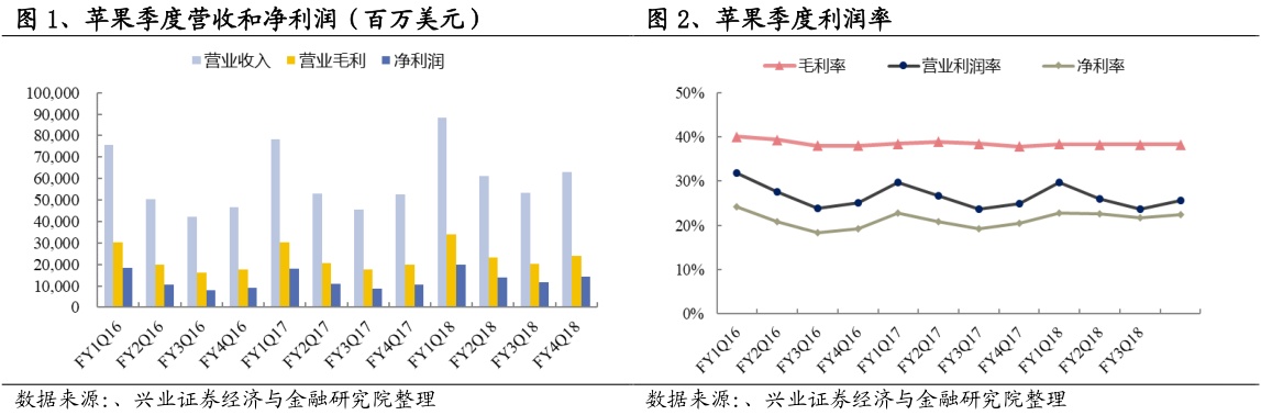营收连续五个季度同比双位数增长,净利润大幅提升。苹果在北京时间11月2日凌晨发布财报,3Q18(即FY4Q18)营收629亿美元,同比增长20%;净利润141亿美元,同比增长32%。其中,利润增长较快的一个原因是税率降低,所得税率从23%下降到14%。每股分红0.73美元。单季度毛利率38.3%,同比增长0.4个百分点;单季度净利率22.5%,同比增长2.1个百分点。苹果给的4Q18(即FY1Q19)业绩指引为收入890-930亿美元;毛利率38%~38.5%;运营费用87~88亿美元;税率约16.5%。苹果四季度营收指引低于市场预期。