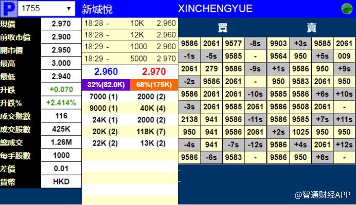 智通财经APP获悉,新城悦(01755)将于11月6日挂牌,上市前夕,据辉立交易场资料显示,暗盘收报2.97元,较招股价2.9元涨0.07元,涨2.414%。每手1000股,不计手续费,每手赚70元。