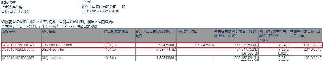 智通财经APP获悉,根据联交所资料显示,GIC Private Ltd于11月2日增持北京汽车(01958)893万股,每股作价4.51港元,总值4027万港元,最新持股量增至7.04%。