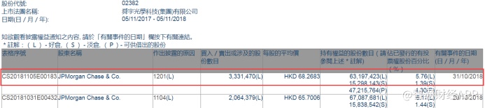 智通财经APP获悉,根据联交所资料显示,摩根大通于10月31日减持舜宇光学科技(02382)333万股,每股作价约68.27港元,总值2.27亿港元,最新持股量减至5.76%。