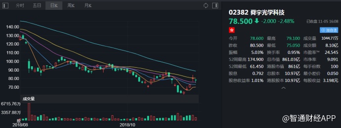 截至今日收盘,舜宇光学科技(02382)报78.5港元,跌2.48%。