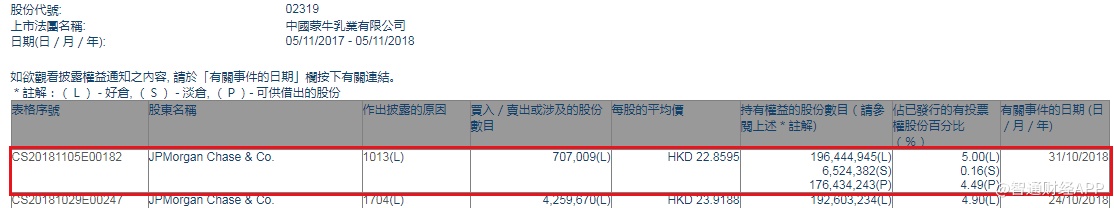 智通财经APP获悉,根据联交所资料显示,摩根大通于10月31日增持蒙牛乳业(02319)71万股,每股作价22.86港元,总值1616万港元,最新持股量增至5%。