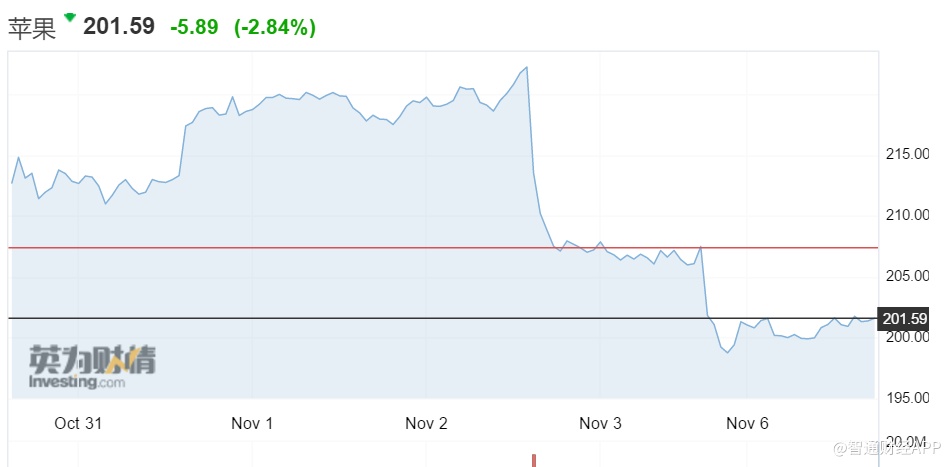 智通财经APP获悉,昨日苹果(AAPL.US)遭券商下调评级,股价周一收跌2.84%,报201.59,盘中更是一度跌破200美元关口。自上周五公布财报以来,其股价已累跌超10%。