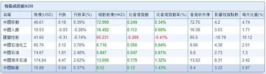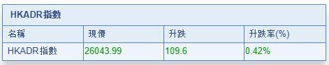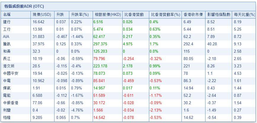 智通财经APP获悉,港股ADR势头良好,按比例计算,收报26043.99点,升109.6点或0.42%。恒指成分股涨跌不一,汇丰控股收报65.231元,较港收市跌0.269元;腾讯控股收报297.375元,较港收市涨4.975元。
