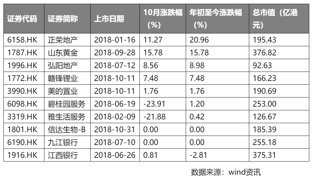 智通财经APP获悉,次新股板块方面,截止10月31日,今年港股共有176家公司新上市,10月份,上涨个股42家,下跌128家,市值50亿港元以上次新股中,年度涨跌幅排名前十的股票分别有正荣地产(06158)、山东黄金、赣锋锂业等,详见下表: