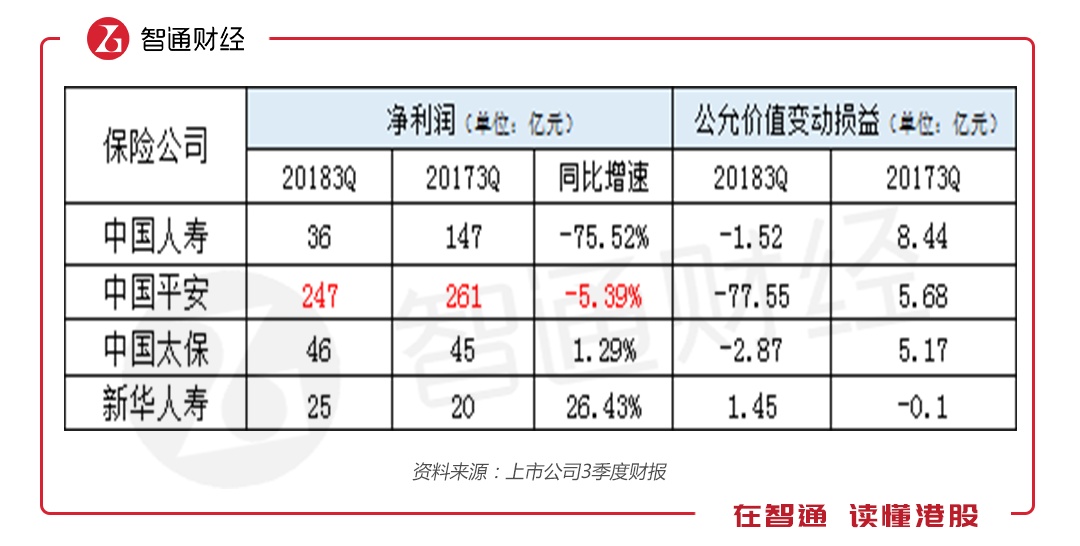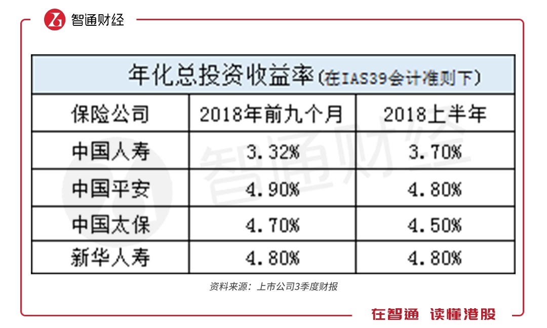 上表显示,中国人寿第三季度净利润同比大幅下滑75.52%,主要原因在投资收益,今年中国人寿总投资收益率为3.32%,同比下降1.80个百分点,其他保险公司的总投资收益率均在4.5%以上,智通财经APP猜测中国人寿在固定收益上的投资表现不佳。新华人寿和中国太保均实现正增长。