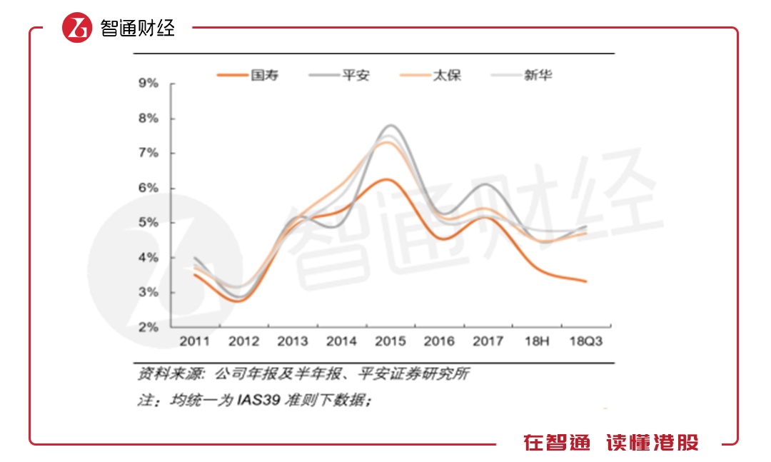 上图显示,保险公司的总投资收益率随着股票市场的波动而波动,例如2015年的大牛市和2017年底的蓝筹股牛市区间,各大保险公司的总投资收益率曲线都形成两个“波峰”。