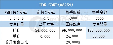 智通财经APP获悉,11月6日,新加坡总承建商HON CORP(08259)配售结束。配售招股价区间为0.5-0.6港元,最终定价0.5港元,每手2000港元。