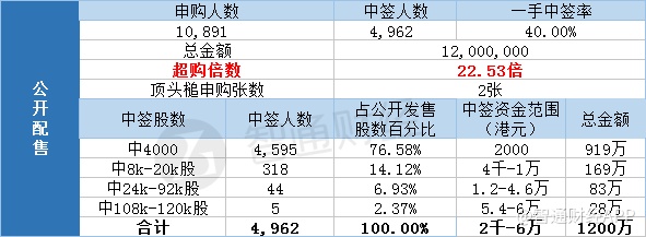 其中,公开配售申购人数10891,一手中签率40%,超购倍数22.53倍。