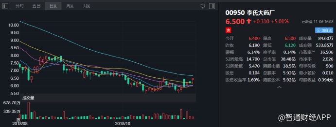 截至今日收盘,李氏大药厂(00950)报6.50港元,涨5.01%。