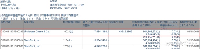 智通财经APP获悉,根据联交所资料显示,摩根大通于11月1日增持华能新能源(00958)745万股,每股作价2.156港元,总值1606.22万港元,最新持股量增至10.03%。