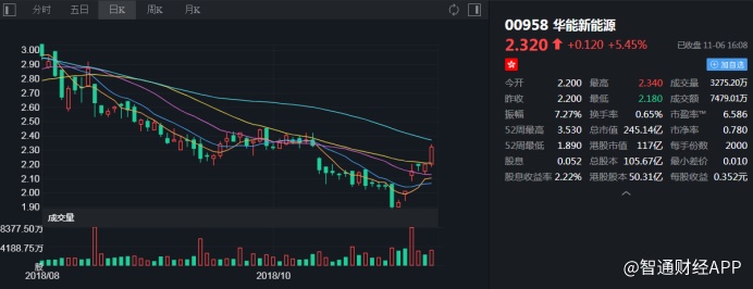 截至今日收盘,华能新能源(00958)报2.32港元,涨5.45%。