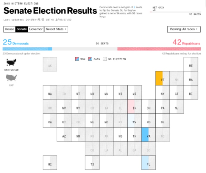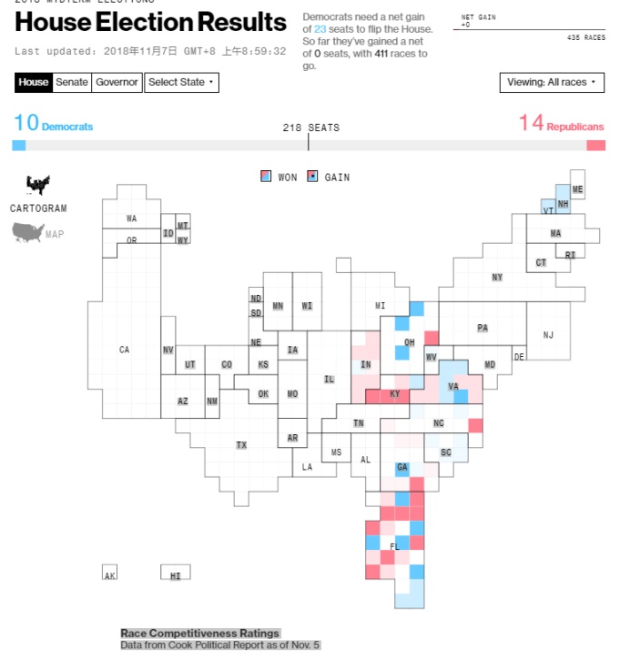智通财经APP获悉,目前市场焦点主要集中再美国中期选举结果上,由于时差问题,美国各州选举结果基本将在北京时间7:00-11:00陆续揭晓。目前,在众议院的选举中,共和党领先民主党。而参议院方面,亦是共和党领先。