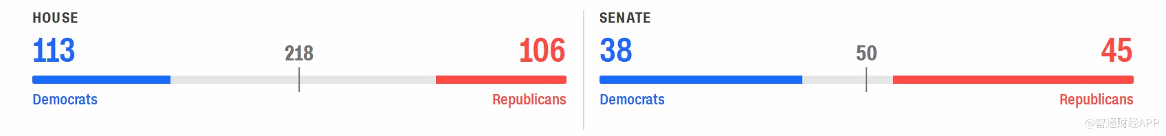 智通财经APP获悉,截至发稿,从目前的投票统计来看,民主党反超共和党,在众议院获得113个席位,领先民主党7个席位。而在参议院中,共和党仍然以45个席位领先于民主党的38个席位。