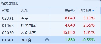 智通财经APP获悉,临近双十一全球购物狂欢节,于2018年11月7日,体育用品股整体相好,截至14:33,李宁(02331)领涨5.1%,特步国际(01368)涨2.65%,安踏体育(02020)涨1.01%。